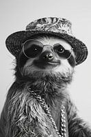 Ein schwarz-weißes Porträt eines Faultiers, bekleidet mit Hut und Sonnenbrille, das lässige Eleganz ausstrahlt. Ein perfektes Bild, das Stil und Tierliebe kombiniert.