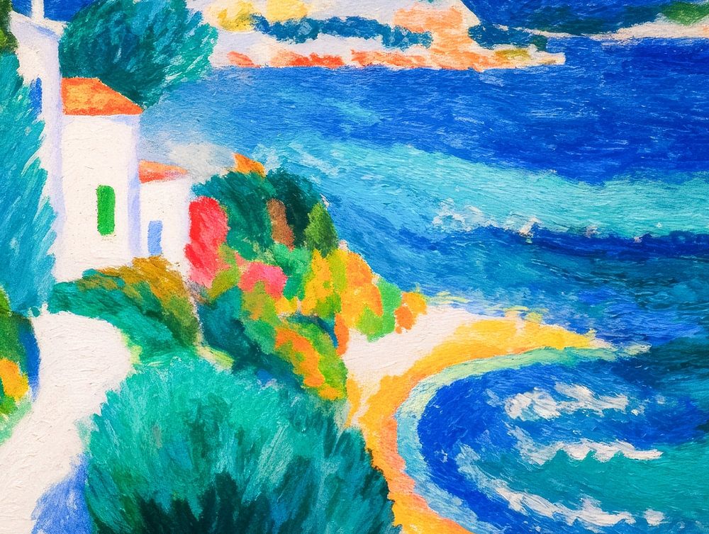 Dieses ausdrucksstarke Gemälde fängt eine sonnige griechische Küstenlandschaft mit weißen Häusern, farbenfroher Vegetation und einem lebhaften blauen Meer ein, ausgeführt in einem modernen, fauvistischen Stil. Die intensiven Farben und dynamischen Pinselstriche bringen das mediterrane Gefühl und die sommerliche Atmosphäre direkt in Ihr Interieur.