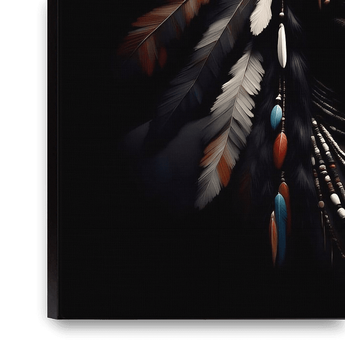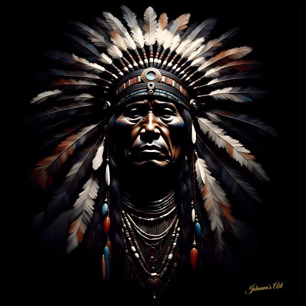 Dieses beeindruckende Porträt zeigt einen indianischen Häuptling mit einem kunstvollen Federschmuck, der mit außergewöhnlicher Detailtreue und Ehrfurcht dargestellt ist. Der Kopfschmuck erhebt sich prominent, jede Feder ist sorgfältig definiert und zeigt eine Harmonie von leuchtenden Farben, die Ehre, Führung und das Erbe der Vorfahren…