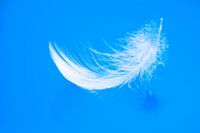 Zarte weiße Feder, die auf blauem Wasser schwimmt, Makrofoto in Nahaufnahme.