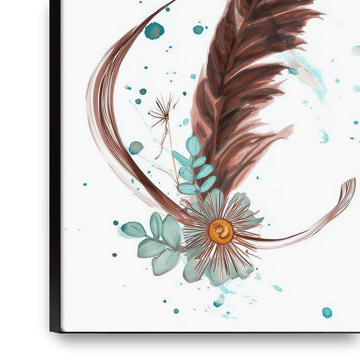 Bestelle dieses Blumen-Wandbild Feder und Blüten in sanften Aquarellfarben von MArt als Reproduktion auf Leinwand, Alu-Dibond, als Poster, Fototapete oder Acrylglasbild.