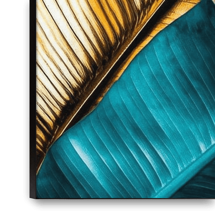 Eine harmonische Verbindung aus leuchtenden Blättern und edlem Marmor entfaltet sich, wo das sanfte Türkis der Federn mit einem strahlenden Gold akzentuiert wird. Diese Komposition weckt den Eindruck von Leichtigkeit und Eleganz, als ob die Natur ein kunstvolles Gespräch mit zeitlosem Luxus führt. Ein Fest für die Ästhetik!