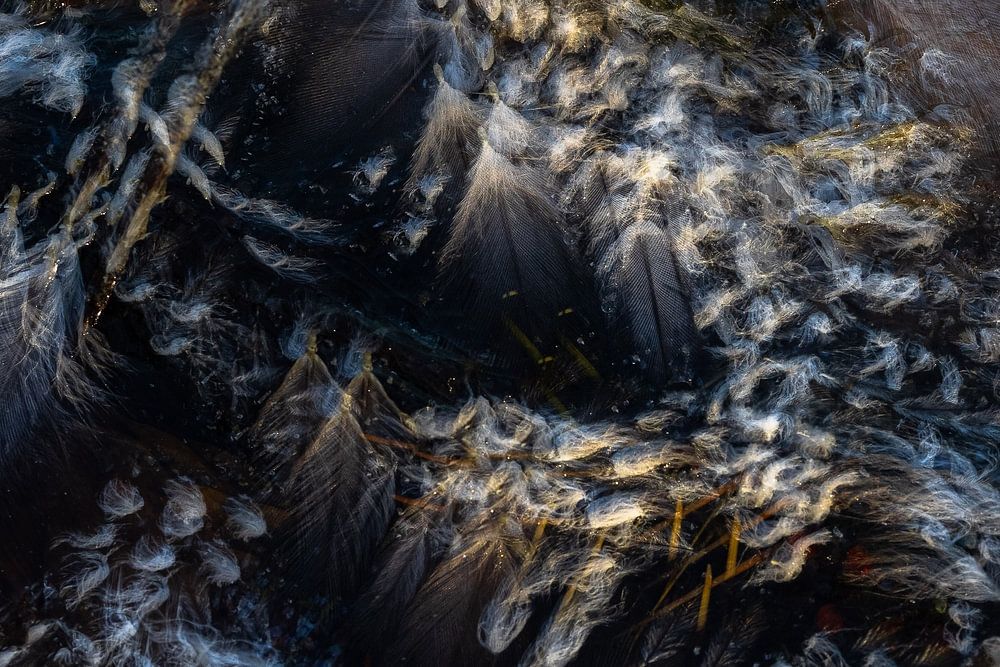 Federn in einem Wasserbecken, die durch unterschiedliche Beleuchtung und Bewegung so aussehen, als würden sie tanzen