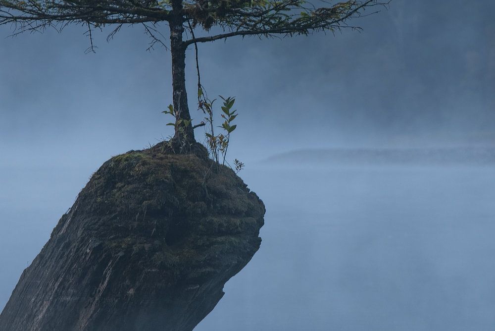 Feenbaum Vancouver Island. Ein Baum, der auf einem alten Stamm im Wasser wächst und eine märchenhafte Umgebung schafft. Fotografiert bei Sonnenaufgang mit Nebel auf dem Wasser.