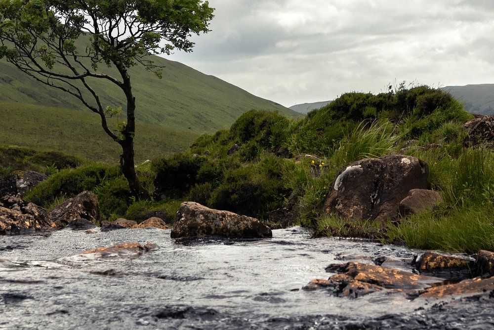 Fairy Pools ist ein Bach oder Fluss auf der Isle of Skye. Das Gebiet wird Glen Brittle genannt. Es ist eine offene Landschaft und aufgrund des Klimas leer und karg. Der Bach enthält viele kleine Wasserfälle, die sich an sonnigen Tagen türkis färben, was diesen Ort zu etwas ganz Besonderem macht. Als wir dort waren, regnete es, was diesem Bild eine düstere Stimmung verleiht. Glücklicherweise verleihen die orangefarbenen Steine und das grüne Gras der Skulptur trotzdem einen lebendigen Eindruck. Der Baum war einer der wenigen in der Gegend, was ihn zu etwas Besonderem macht. Für dieses Foto habe ich eine niedrige Position der Kamera gewählt, nahe am Boden. Auf diese Weise konnte ich dem Wasser einen wichtigen Platz in der Komposition einräumen. Außerdem hat dies dazu beigetragen, dem Foto Tiefe zu verleihen. Der Stein im Vordergrund, der Baum in der Mitte und die Berge im Hintergrund.