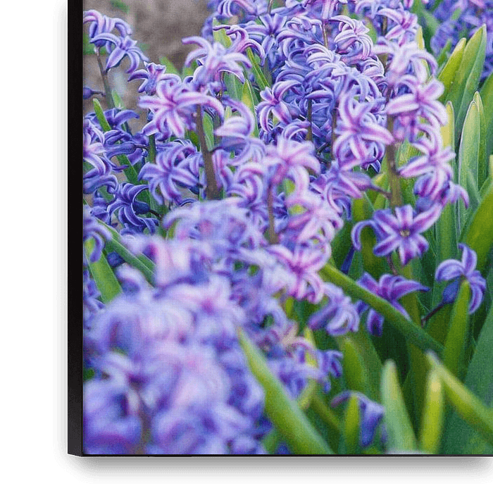 Bestelle dieses Blumen-Wandbild Feld mit lila Hyazinthen von Stefanie de Boer als Reproduktion auf Leinwand, Alu-Dibond, als Poster, Fototapete oder Acrylglasbild.