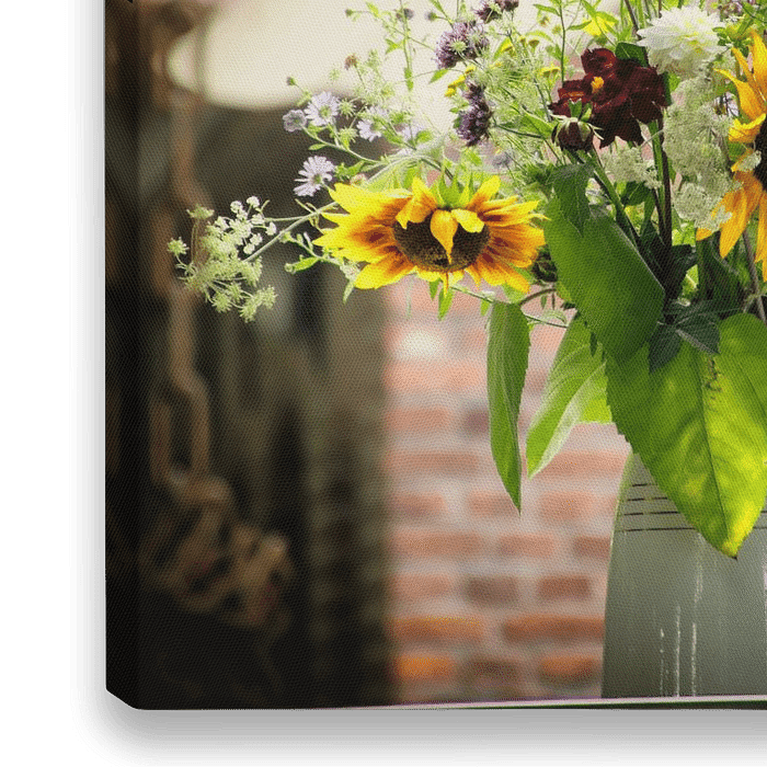 Feldblumenstrauß in einer altmodischen Dose mit einem Teil der Farm im Hintergrund. Hergestellt im Teegarten von Hoeve Groot Zandbrink in Leusden.
