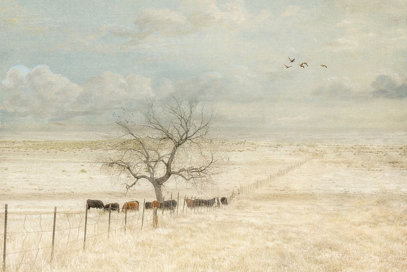 Eine Kuhherde weidet friedlich an einem einsamen Baum in einer goldenen Landschaft, während ein Schwarm Vögel am weiten Himmel vorbeifliegt.