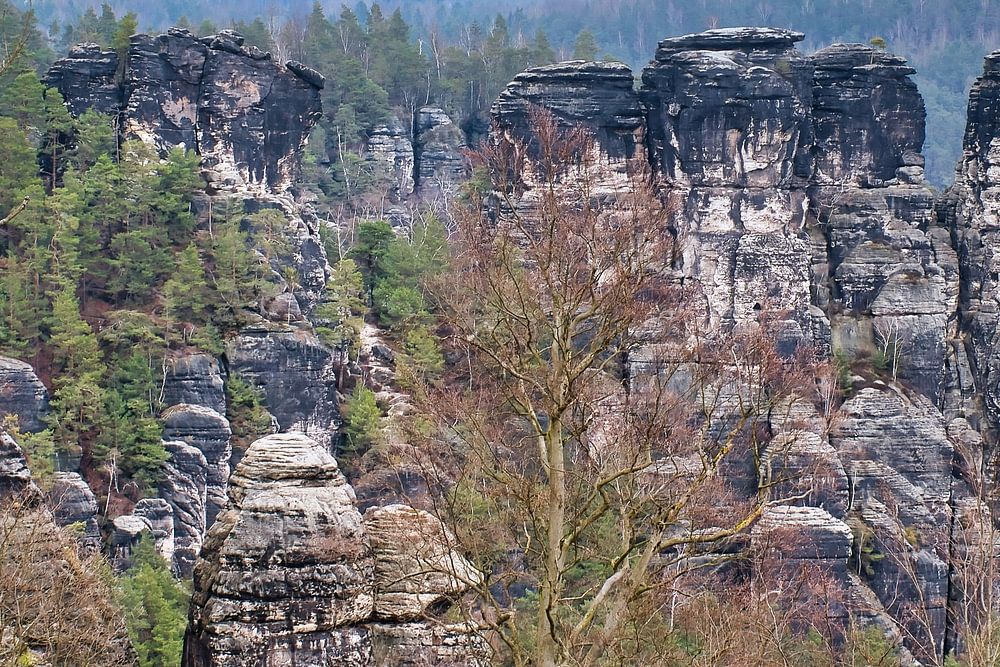 Felsen im Elbsandsteingebirge an der Bastei. Zerklüftetes Gestein umgeben von Bäumen.