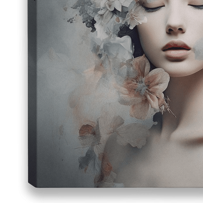 Ein helles, abstraktes und surreal wirkendes Frauenporträt mit feinem, dezentem Blütenschmuck, der sanft und filigran auf ihrem Kopf ruht. Die Blüten sind in zarten, harmonischen Farben gehalten und wirken beinahe schwebend, als würden sie leicht und verträumt über ihr schweben. Der helle Hintergrund verstärkt die Leichtigkeit und…