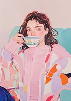 Ein Gouache-Gemälde einer italienischen Frau in den späten Dreißigern, die auf der Couch sitzt, eine Hand hochhält und aus einer bunten Teetasse trinkt, während sie einen übergroßen pastellfarbenen Pullover trägt. Sie hat schulterlanges braunes Haar und blickt direkt in die Kamera. Der Hintergrund ist hellrosa. Sie hat verschiedene…