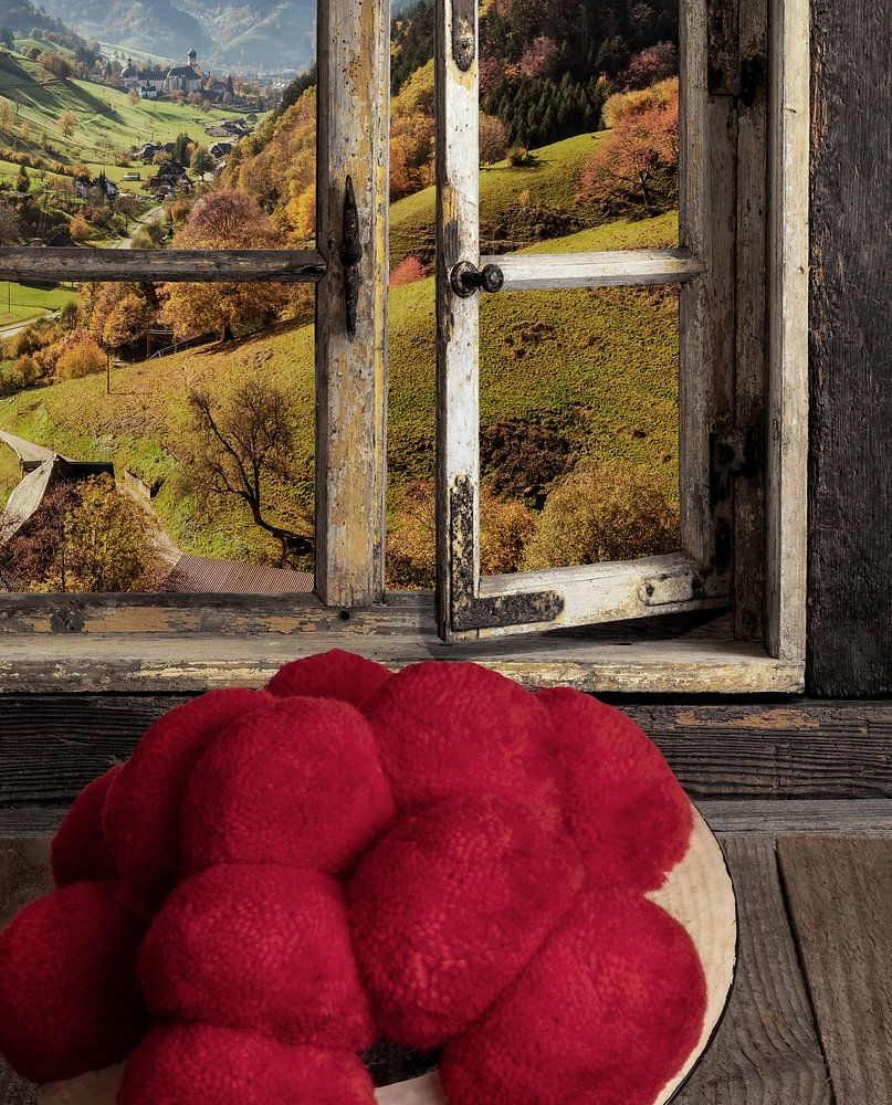 wundervoller Fensterblick aus der Bauernstube mit Bollenhut ins Münstertal im Schwarzwald, composing