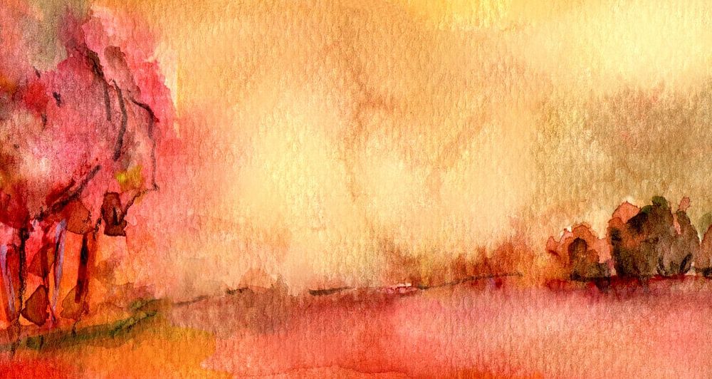 Aquarellmalerei...rote weitläufige Landschaft mit Baumgruppe...