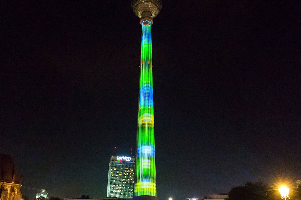 Der berühmte Fernsehturm in der deutschen Hauptstadt in besonderer Beleuchtung, anlässlich eines Licht-Events in Berlin.