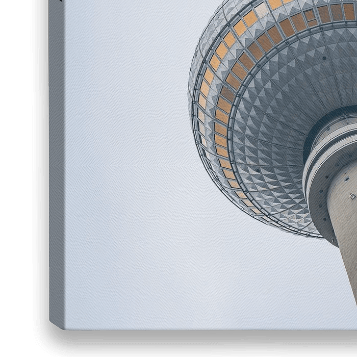 Der Berliner Fernsehturm ragt hoch in den Himmel an einem bedeckten Tag mit Wolken