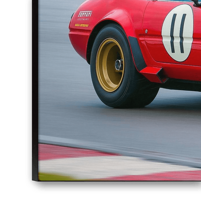 Klassischer Ferrari 365 GTB/4 Daytona Competizione Rennwagen, der mit hoher Geschwindigkeit auf einer Rennstrecke im Regen fährt. Der 365 GTB/4 ist ein zweisitziger Grand Tourer, der von 1968 bis 1973 von Ferrari produziert wurde und den Spitznamen Daytona erhielt, nachdem Ferrari bei den 24 Stunden von Daytona im Februar 1967 einen 1:3-Sieg errungen hatte.