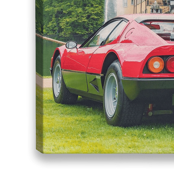 Ferrari 512 BB oder Berlinetta Boxer Italienische Sportwagen aus den 1970er Jahren und Ferrari 308 GTB aus den 1980er Jahren, die vor Schloss Dyck ausgestellt sind.