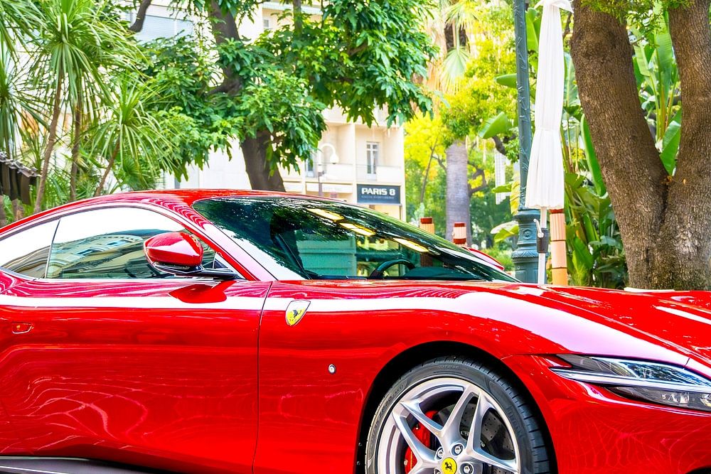 Der große Tourenwagen Ferrari Roma (Typ F169) parkt auf der Straße vor dem Hotel Hermitage in Monte Carlo. Der Roma hat einen vorderen Mittelmotor, Hinterradantrieb, einen V8-Motor mit Doppelturboaufladung und eine 2+2-Sitzanordnung. Das Design wurde von den klassischen Ferrari 250 GT Lusso und 250 GT 2+2 Grand Touring Cars der 1960er Jahre beeinflusst.