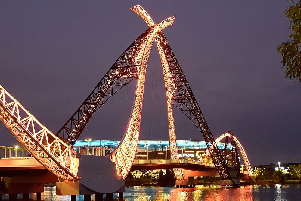 Festliche gelbe Farben auf der Matagarup-Brücke in der Stadt Perth, Westaustralien. Nach Sonnenuntergang wird die Brücke immer von Tausenden von LEDs beleuchtet. Bei besonderen Anlässen oder Weltereignissen werden spezielle, auf das Ereignis abgestimmte Farben verwendet. An anderen Tagen werden verschiedene und wechselnde Farbschemata verwendet.