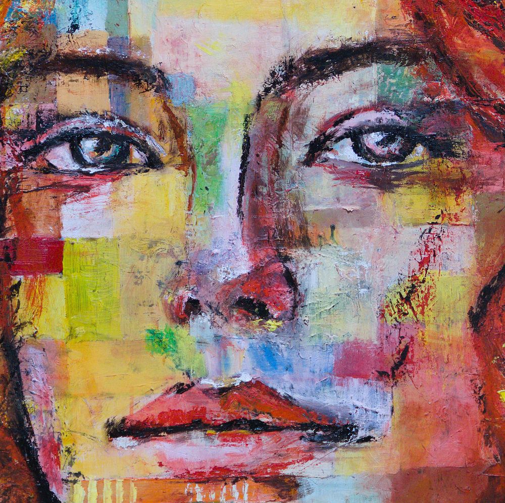 Was für eine Schönheit. Ein Porträt einer Frau mit roten Haaren, dargestellt mit einer Palette von vielen Farben. Anja Namink hat die Schönheit der Frau in diesem mit Ölfarbe gemalten Porträt gesucht. Die leuchtenden Farben passen wunderbar zu ihrem schwülen und verträumten Gesicht, das von einer Wolke aus rotem Haar umgeben ist.