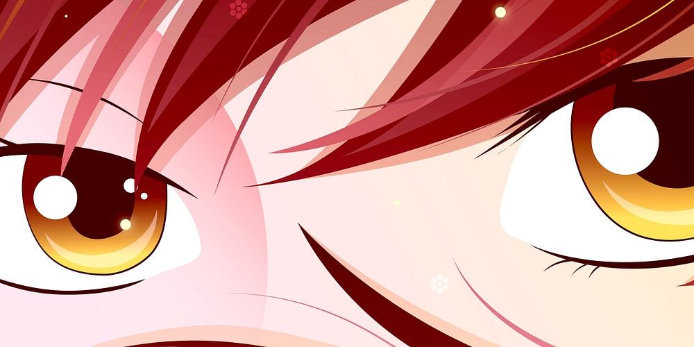Dieses Bild zeigt eine Nahaufnahme eines Gesichts im Manga-Stil mit Fokus auf zwei intensiv leuchtende Augen. Die goldenen Iriden wirken durch weiße Lichtreflexe fast glühend, während das umgebende Haar in kräftigen Rottönen mit feurigen Highlights gestaltet ist. Um die Augen und das Haar herum schweben kleine rote und orangefarbene Partikel, die dem Bild eine zusätzliche Dynamik verleihen.