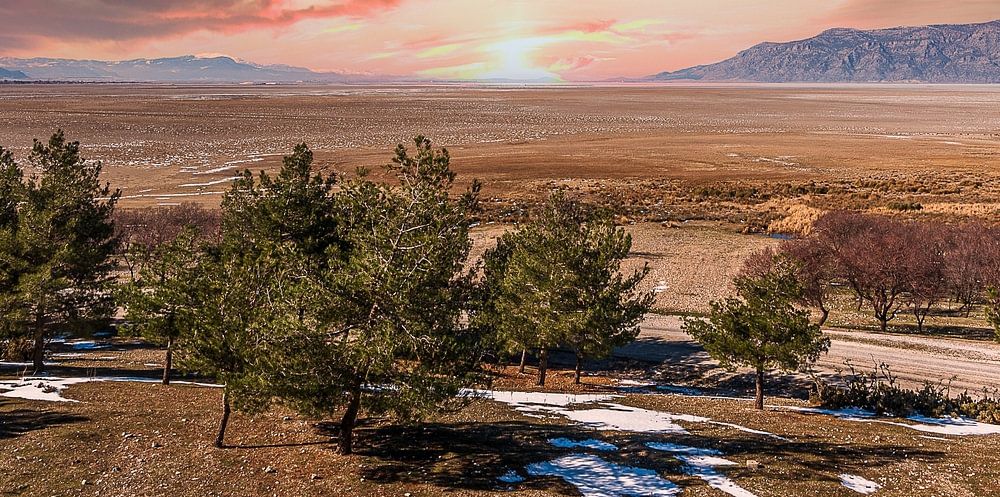 Die Salzseen von Afyonkarahisar mit schneebedeckten Berggipfeln im Hintergrund bei Sonnenuntergang.