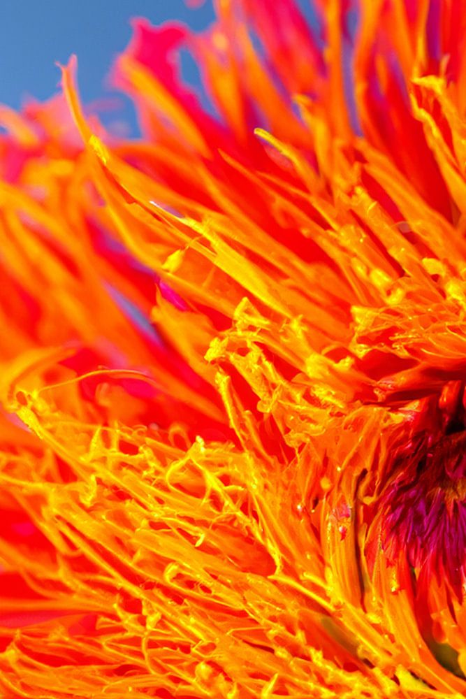 Das Bild zeigt eine große, prachtvolle Blume – ihre Blütenblätter leuchten in einem intensiven Rot, das an feurige Flammen erinnert, während ihr Inneres in warmem Gelb erstrahlt. Der Hintergrund ist himmelblau und schafft einen sanften Kontrast zu den kräftigen Farben im Vordergrund. Diese Farbkombination vermittelt eine Atmosphäre…