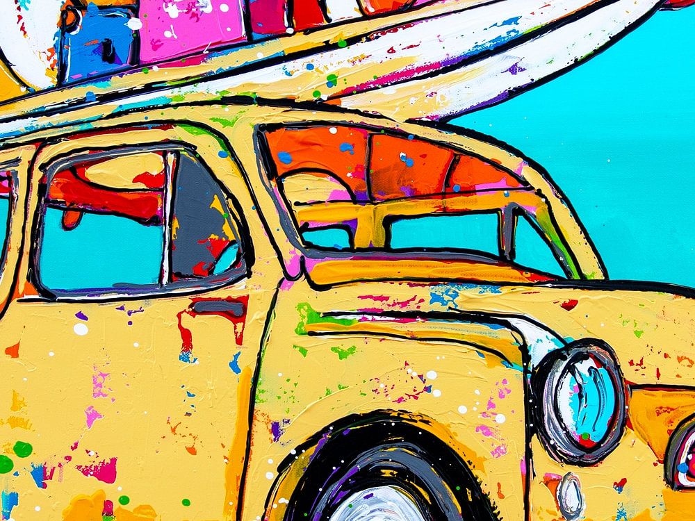 Das Leben ist ein schönes Abenteuer! Dieses farbenfrohe Gemälde zeigt einen klassischen Fiat 500, der am Sandstrand geparkt und mit Strandutensilien beladen ist. Bereit für Sonne, Meer und endlosen Spaß!