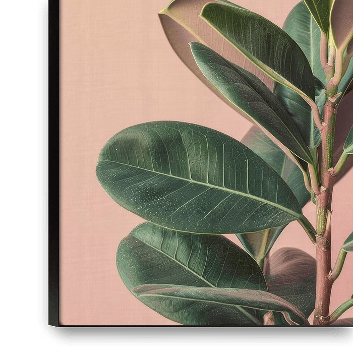 Dieses Werk zeigt einen Ficus elastica in seiner reinsten und elegantesten Form. Die Pflanze steht zentral vor einem sanften, puderrosa Hintergrund, wodurch die kraftvolle Form der Blätter voll zur Geltung kommt. Die ovalen, dunkelgrünen Blätter haben einen subtilen Glanz und deutliche Adern, was für ein schönes Spiel zwischen Licht und…