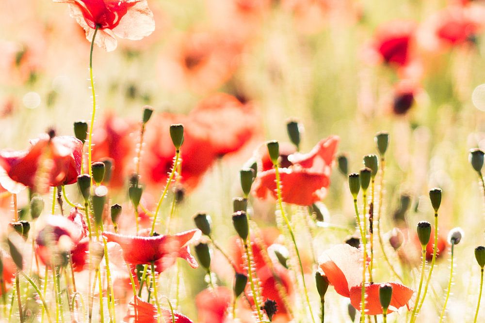 Een veld klaprozen brengt geluk en kleur in het zomerse Limburgse Heuvvelland op een warme zonnige zomer ochtend