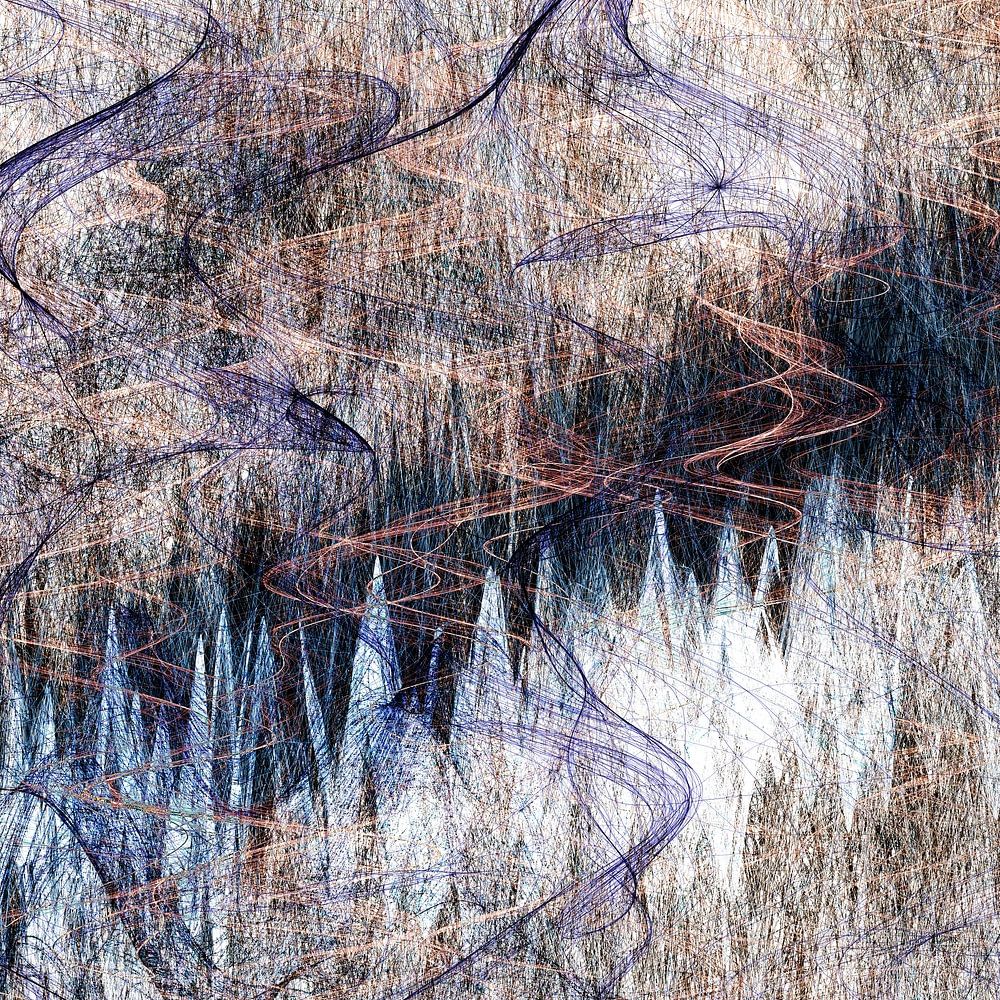 Abstrakte digitale Malerei mit komplexen Texturen und mehreren Farben, die eine dynamische und faszinierende Landschaft schaffen.
