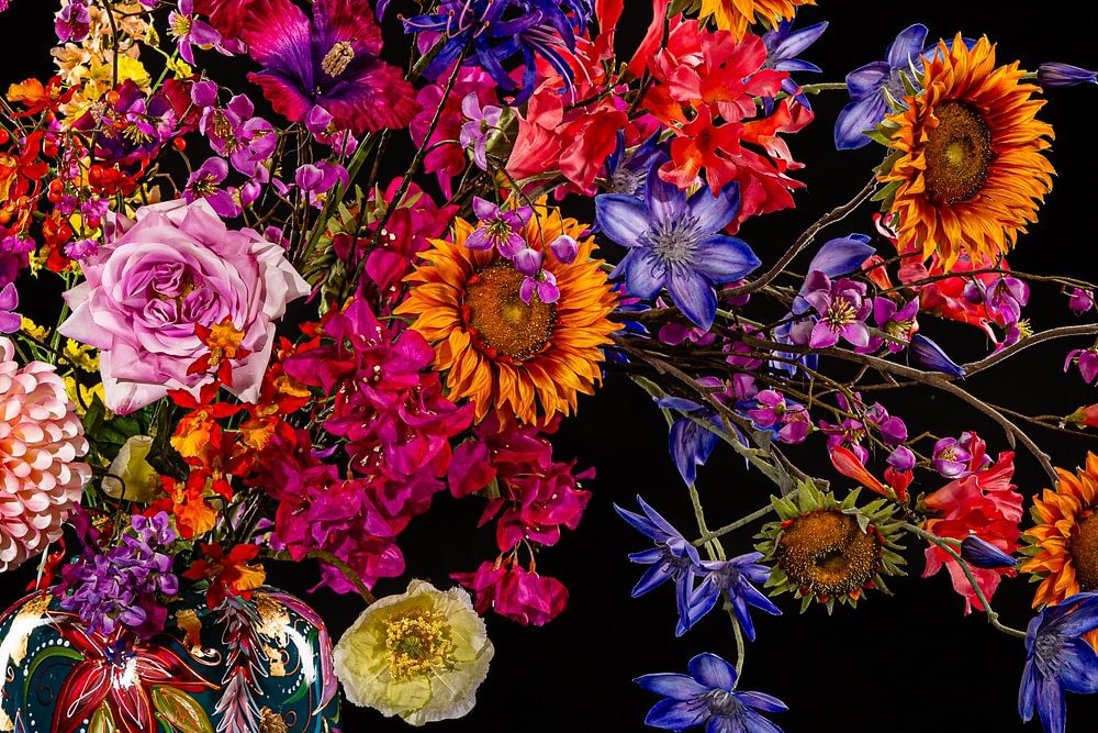Ein wunderschön beleuchtetes Blumenarrangement vor einem schwarzen Hintergrund. Die Sonnenblumen, Rosen und anderen farbenfrohen Blumen sind von Reneé v.d. Voort in einer von Rose v.d. Voort bemalten Vase arrangiert. Diese wunderschönen Kreationen sind in dem schönen Blumenladen Fiori di Rose in Oosterbeek zu kaufen: https://www.fioridirose.nl/