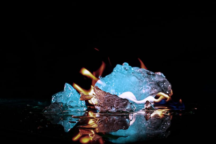 Der Eisbrocken steht auf einem glatten Spiegel, der die Flammen und die Konturen…