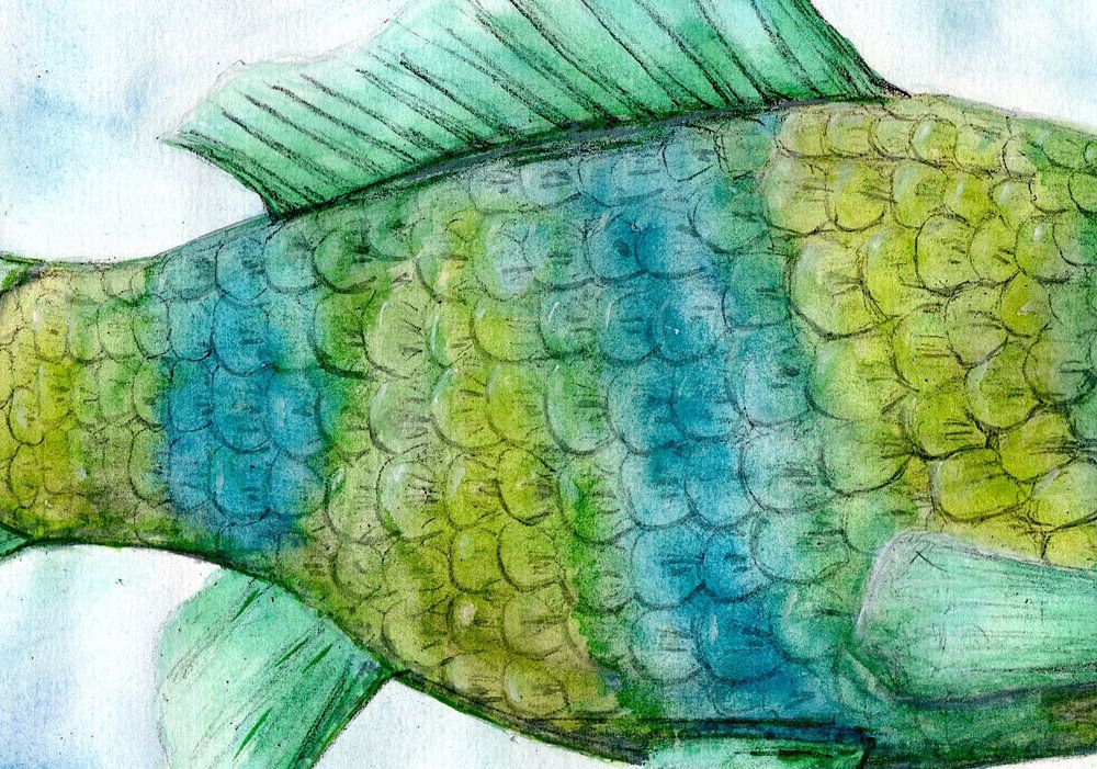 Dieses Aquarell zeigt einen Fisch in grünen, blauen und gelben Farbverläufen. Als Krafttier steht der Fisch für Intuition, Wahrnehmung, Ruhe, Vertrauen und Fluss des Lebens. Er unterstützt dabei, auf das Innere zu hören und sich vertrauensvoll treiben zu lassen.