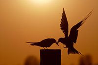 Im warmen Licht der untergehenden Sonne kehrt der Flussseeschwalbe zurück, ein silbern schimmernder kleiner Fisch baumelt aus seinem Schnabel. Auf dem Pfahl am Ufer wartet seine neue Partnerin – still, wachsam, doch mit einer sanften Anspannung in ihrer Haltung.