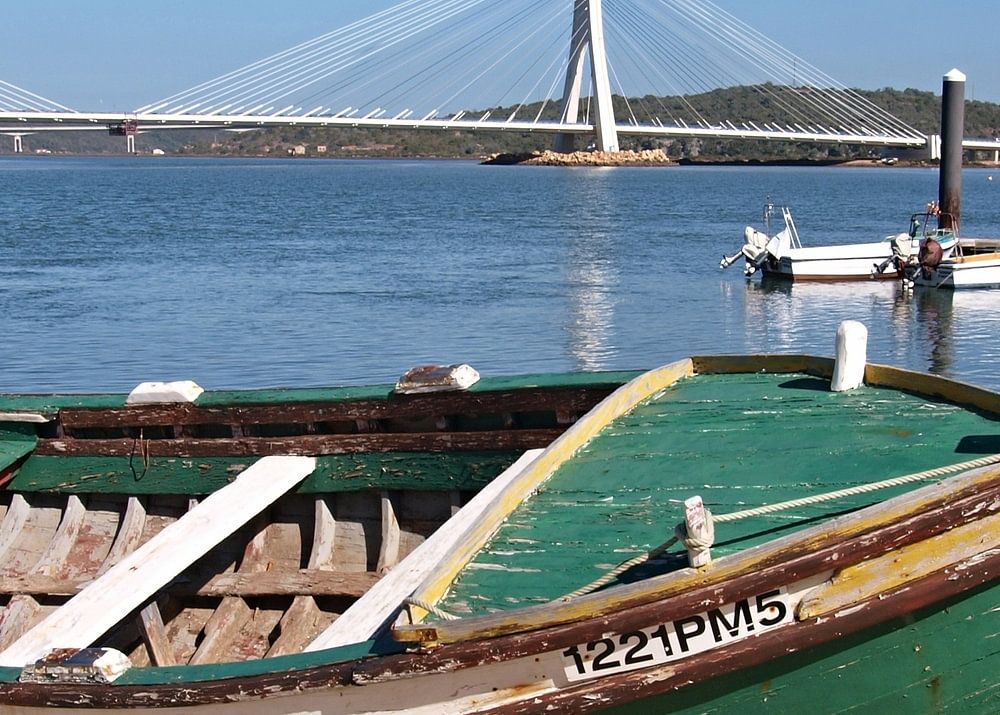 Ein traditionelles Fischerboot mit der modernen Aradebruecke bei Portimao