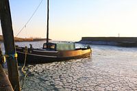 Ein Fischerboot im Hafen von Laaksum am Ijsselmeer. Eine niedrige Sonne scheint, rote Reflexionen auf dem Behälter zu werfen. Der Hafen ist mit Eis gefüllt, aber auch draußen auf dem See ist das Wasser gefroren.
