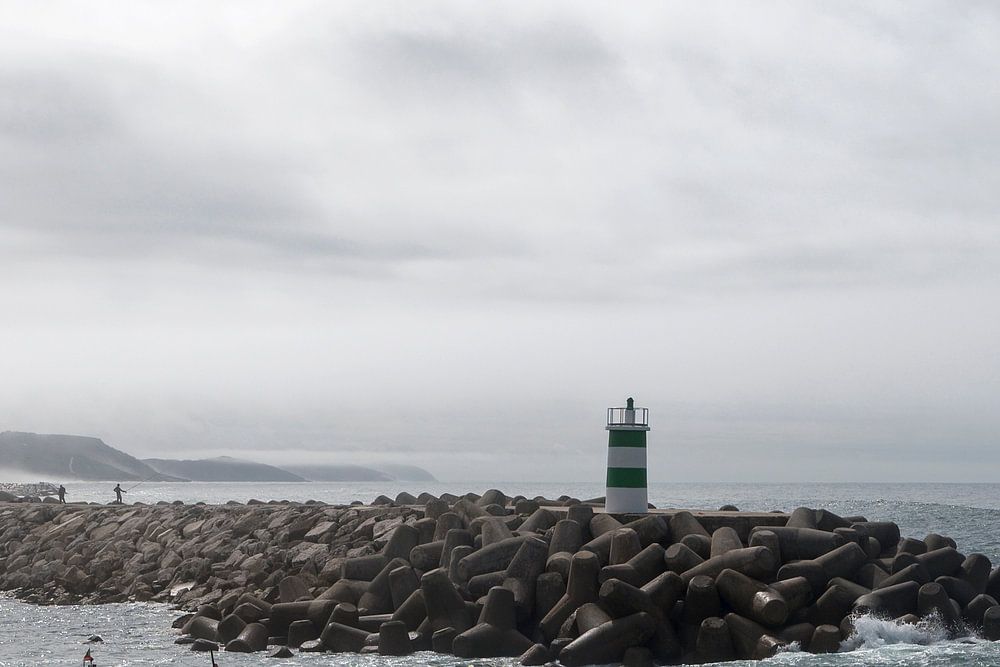 Ein Fischerboot segelt in der Nähe von Nazare, Portugal, aufs Meer hinaus