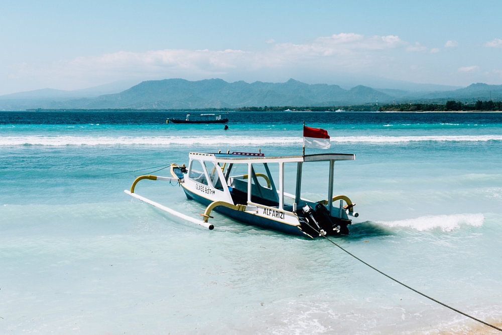 Ein Fischerboot treibt vor der Küste von Gili Air, einer kleinen Insel nordwestlich der Insel Lombok (Indonesien).