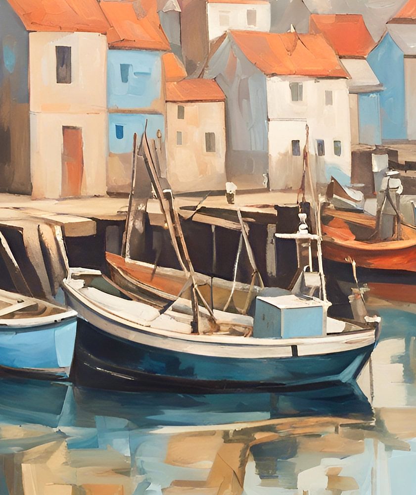 Gemälde eines kleinen alten Fischerhafens im Stil des abstrakten Expressionismus.