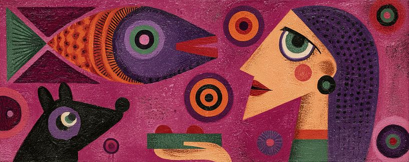 Details: Frauenbild, Fischbild, schwarzes Tier, farbenfrohe Kunst, moderne Kunst, geometrische Formen, weibliche Figur,…
