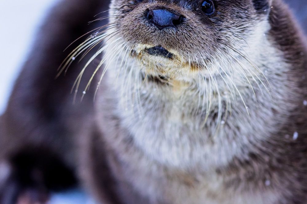 Fischotter (Lutra lutra) im Schnee im Tier-Freigelände im Nationalpark Bayerischer Wald in Bayern, Deutschland.