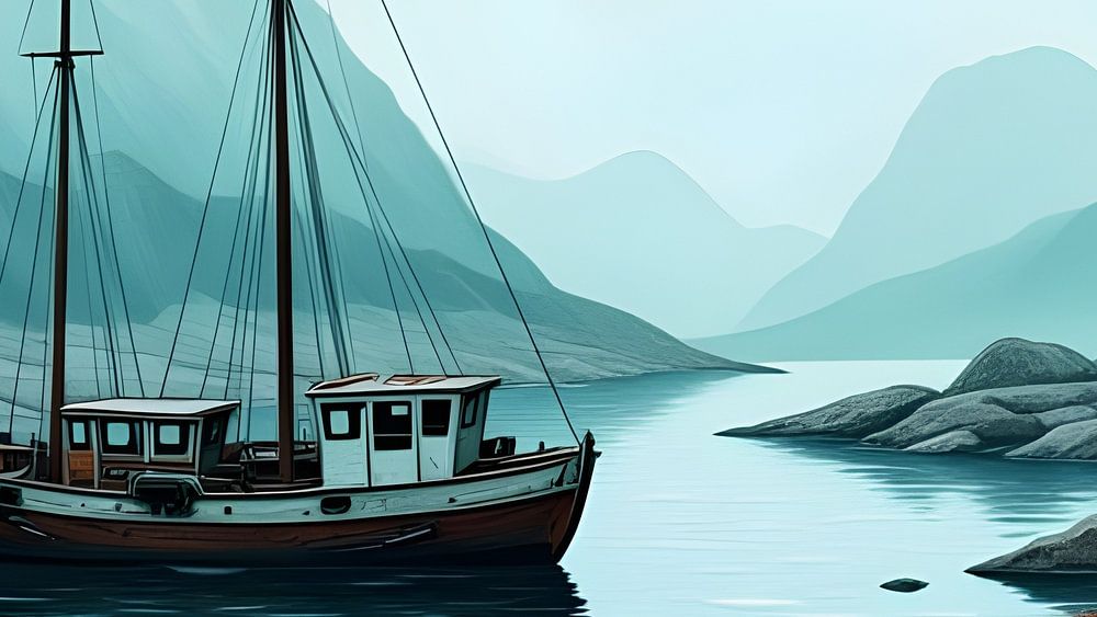 eine nebelverhangene Fjordlandschaft mit einem kleinen Trawler