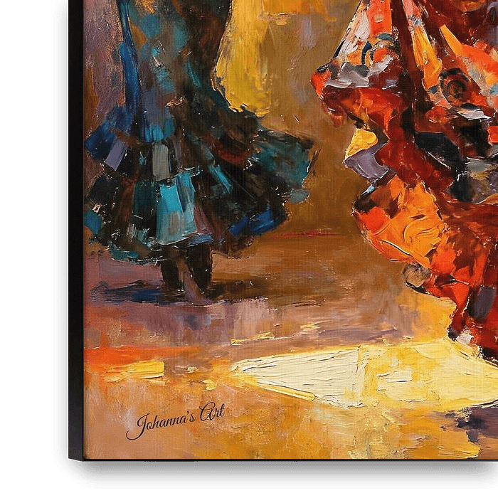 Dieses lebhafte Ölgemälde fängt die Seele des Flamenco durch die kraftvolle Präsenz dreier Frauen ein, die in den Tanz eintauchen. Die Haupttänzerin in der Mitte zieht die Aufmerksamkeit auf sich. Ihre Arme sind anmutig ausgestreckt und ihr farbenprächtiger Rock wirbelt in einer dynamischen Bewegungsdarstellung um sie herum.…