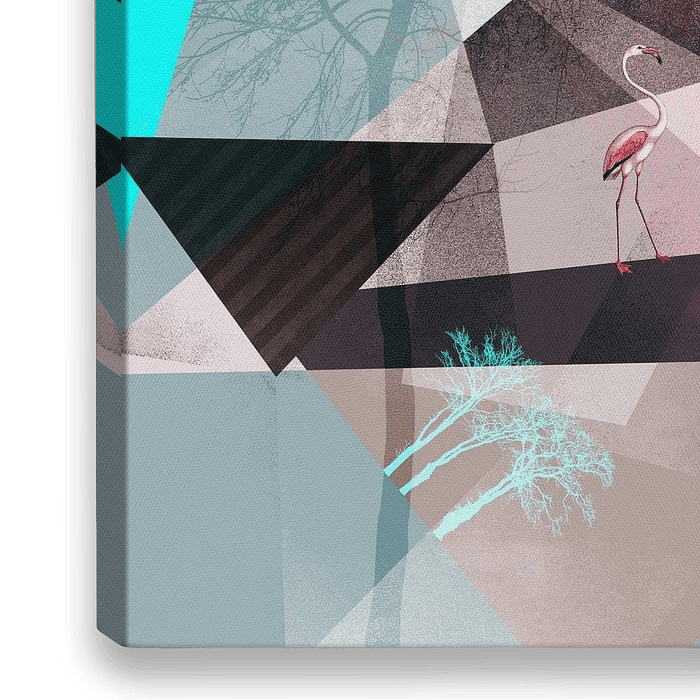 A flamingo is walking through a graphical fantasy landscape, consisting of geometric shapes and tree silhouettes. ©2015/2016 Pia Schneider | atelier COLOUR-VISION.
