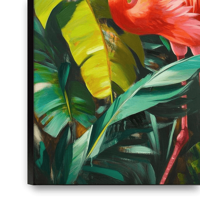 Bestelle dieses Vögel Wandbild Flamingo im Dschungel von Poster Art Shop als Reproduktion auf Leinwand, Alu-Dibond, als Poster, Fototapete, ArtFrame oder Acrylglasbild, maßgefertigt in höchster Qualität.