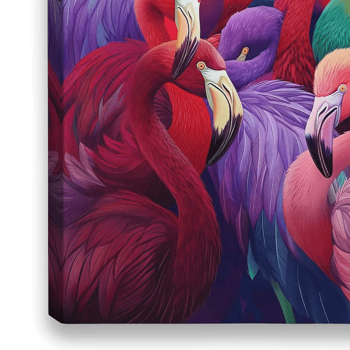 Buntes Porträt einer Gruppe von Flamingos im Dschungel.