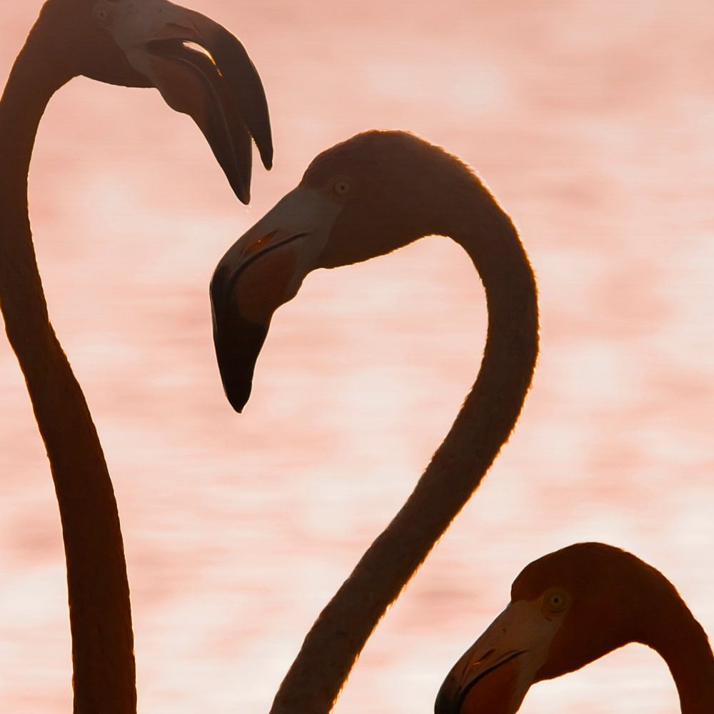Mit dem Sonnenuntergang geht ein heißer Tag zu Ende. Im letzten Licht suchen sich drei Flamingos gegenseitig. Eine starke Abendbrise weht ihre rosa Federn.