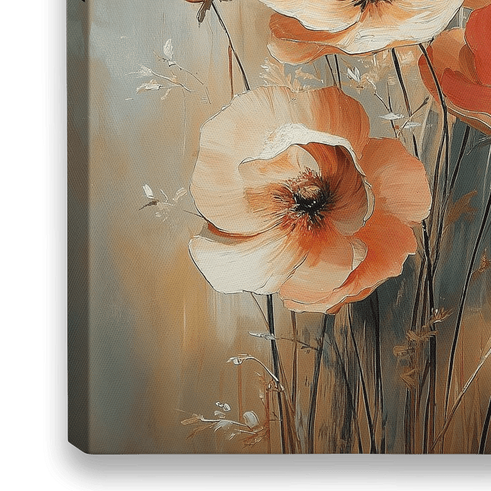 Dieses Kunstwerk zeigt eine kraftvolle und lebendige Darstellung wunderschön gefärbter Mohnblumen in voller Blüte. Die intensiven Rot-, Orange- und Goldtöne strahlen Wärme und Leidenschaft aus, während die geschwungenen und wellenförmigen Formen ein Gefühl von Anmut und Bewegung erzeugen. Die ausdrucksstarken Pinselstriche und der…