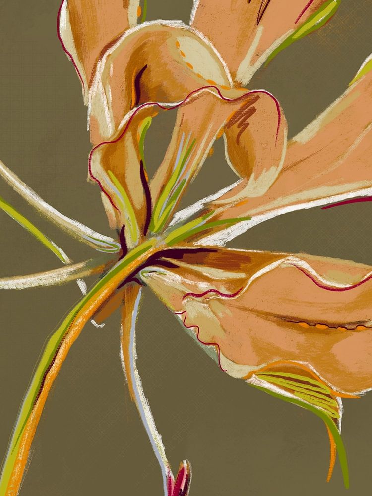 Die Serie "Out of the ordinary" ist von den seltensten Blumen der Welt inspiriert. Jede Blume hat ihre eigenen, einzigartigen Merkmale, Formen und Farben. Die Flammenlilie, auch Feuerlilie genannt, ist zwar keine so seltene Blume, aber in einigen Ländern ist sie vom Aussterben bedroht. Die Feuerlilie ist eine auffällige trompetenförmige Blume mit roten und orange-gelben Blütenblättern, die wie Flammen aussehen. Sie ist in Asien und den tropischen Teilen Afrikas heimisch. In Sri Lanka sind sie heute selten und in Odisha fast ausgestorben, was sie zu einer sehr seltenen Blume in Indien macht. Auch in Ländern wie Australien, den Cookinseln und Französisch-Polynesien gilt sie als invasive Art. Obwohl diese Blumen in der freien Natur vorkommen, sind sie auch in den Gärten der Menschen anzutreffen. Out of the ordinary wurde als digitales Gemälde durch Zeichnen auf einem Tablet mit digitalen Pinseln und Stiften erstellt. Dadurch lässt sich das Werk auf jedem Material wunderbar drucken. Inspiriert von traditionellen Maltechniken, wird das Kunstwerk in mehreren Schichten aufgebaut, wodurch die Farben an Tiefe gewinnen.